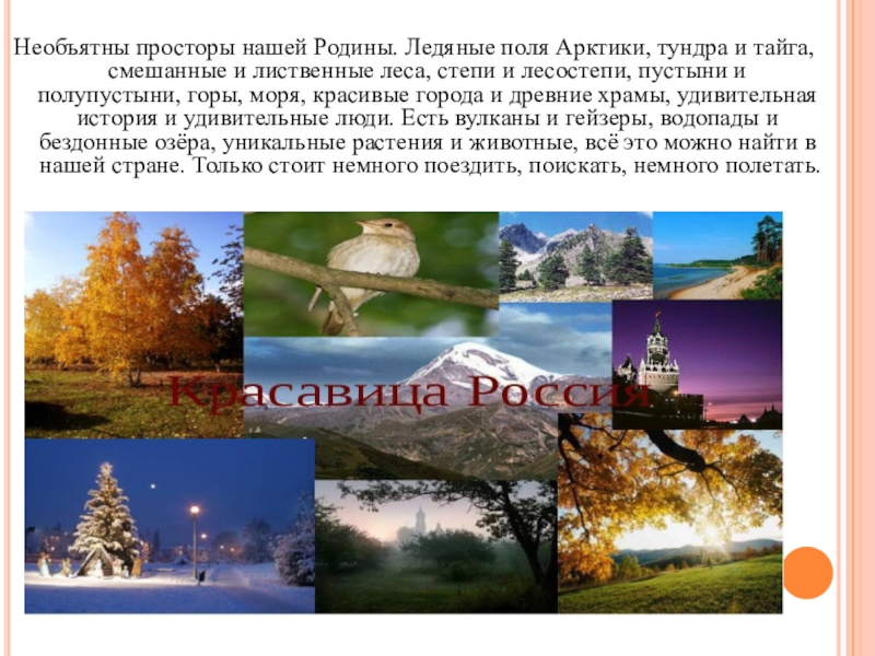 Слайд 3Необъятны просторы нашей Родины. Ледяные поля Арктики, тундра и тайга, смешанные