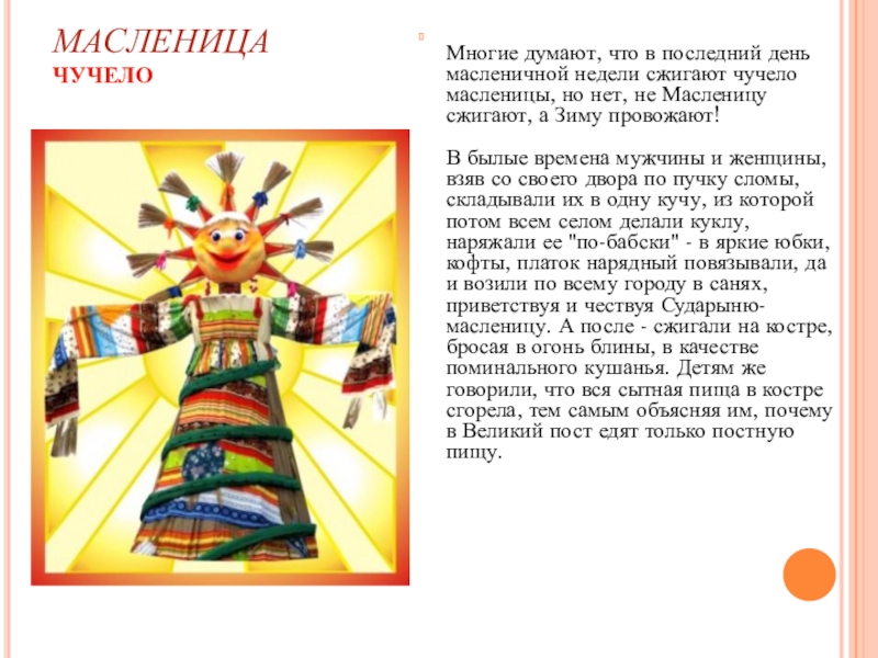 Многие думают, что в последний день масленичной недели сжигают чучело масленицы,