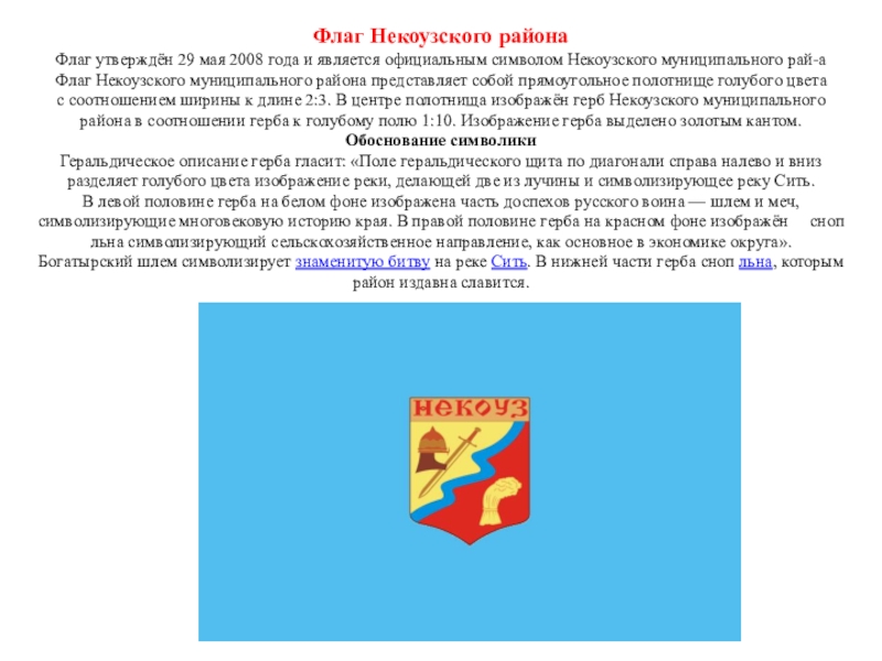 Флаг Некоузского района Флаг утверждён 29 мая 2008 года и является официальным символом Некоузского муниципального рай-а Флаг Некоузского муниципального района представляет собой прямоугольное полотнище голубого цвета с соотношением ширины к длине 2:3. В центре полотнища изображён герб Некоузского муниципального района в соотношении герба к голубому полю 1:10. Изображение герба выделено золотым кантом. Обоснование символики Геральдическое описание герба гласит: «Поле геральдического щита по диагонали справа налево и вниз разделяет голубого цвета изображение реки, делающей две из лучины и символизирующее реку Сить. В левой половине герба на белом фоне изображена часть доспехов русского воина — шлем и меч, символизирующие многовековую историю края. В правой половине герба на красном фоне изображён сноп льна символизирующий сельскохозяйственное направление, как основное в экономике округа». Богатырский шлем символизирует знаменитую битву на реке Сить. В нижней части герба сноп льна, которым район издавна славится.