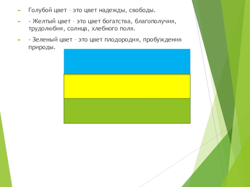 Голубой цвет – это цвет надежды, свободы.- Желтый цвет – это цвет богатства, благополучия, трудолюбия, солнца, хлебного