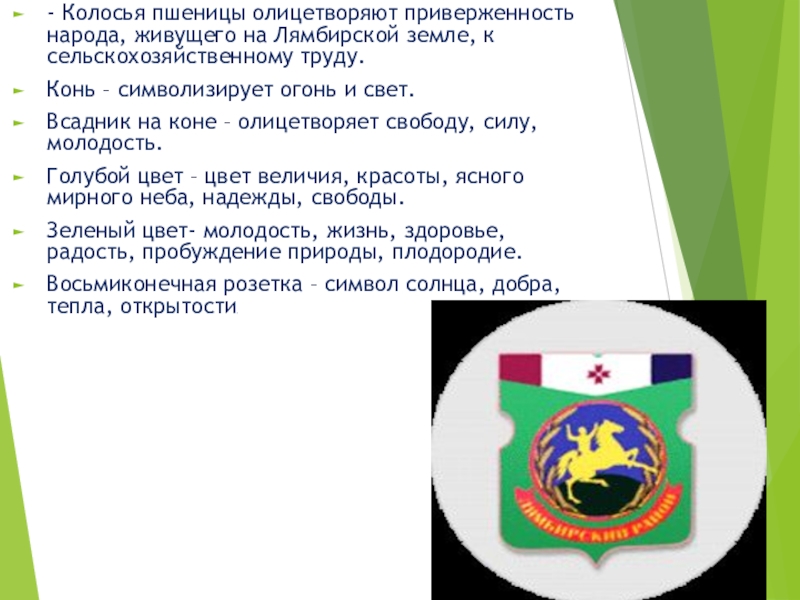 Слайд 7- Колосья пшеницы олицетворяют приверженность народа, живущего на Лямбирской земле, к