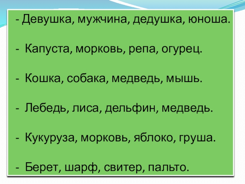- Девушка, мужчина, дедушка, юноша.   -  Капуста, морковь, репа, огурец.   -  Кошка, собака, медведь,