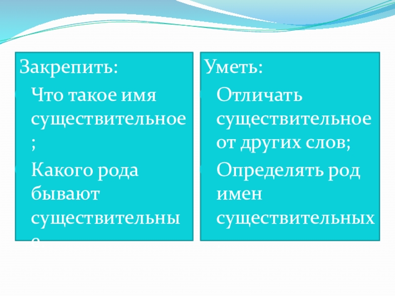 Закрепить:Что такое имя существительное;Какого рода бывают существительные.Уметь:Отличать существительное от других слов;Определять род имен существительных.
