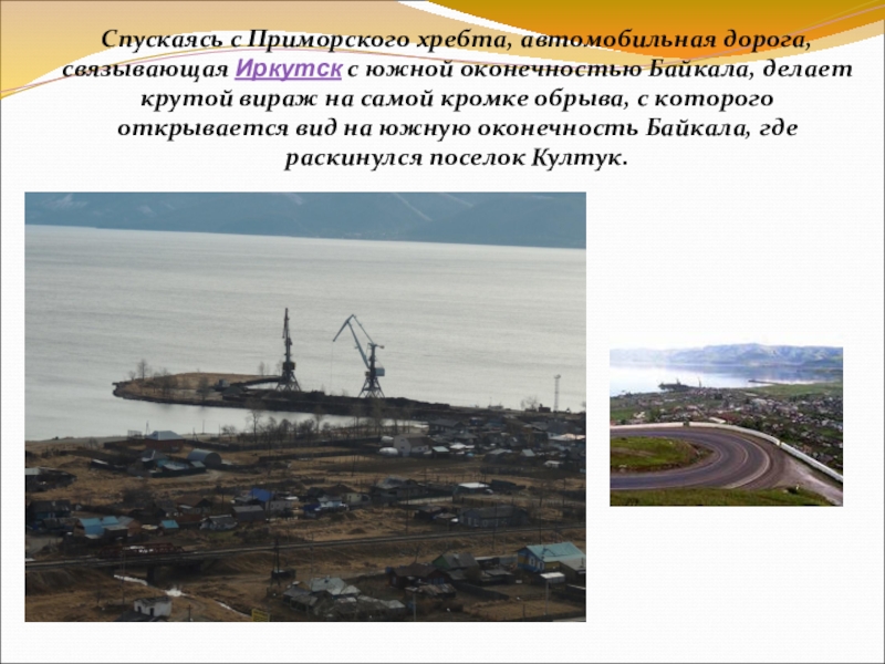 Слайд 2Спускаясь с Приморского хребта, автомобильная дорога, связывающая Иркутск с южной оконечностью Байкала, делает