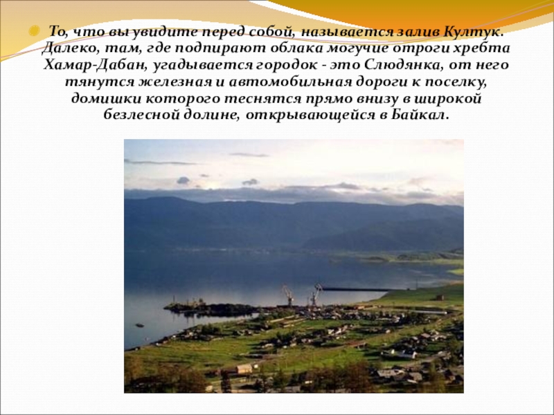 Слайд 3То, что вы увидите перед собой, называется залив Култук. Далеко, там,