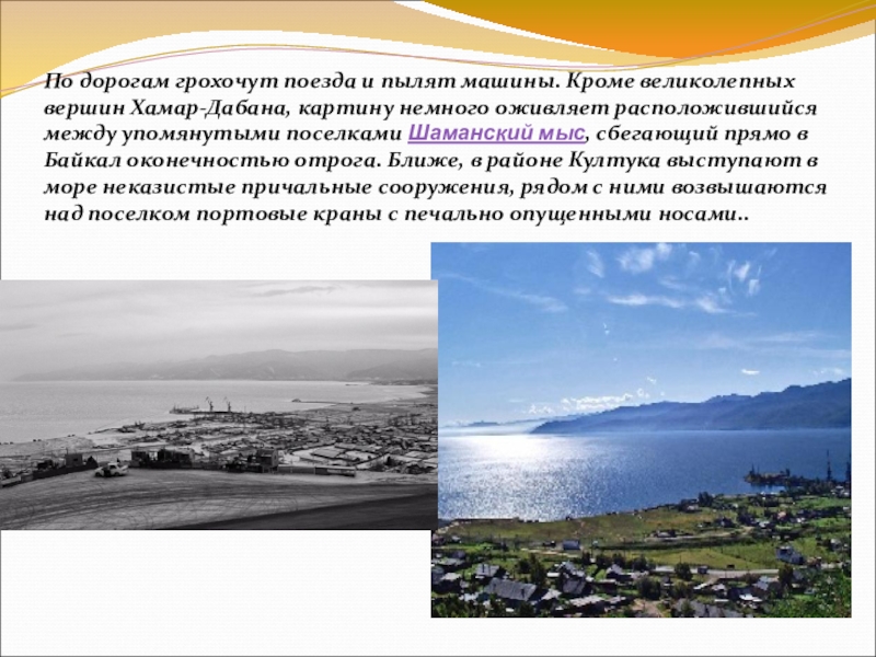 Слайд 4 По дорогам грохочут поезда и пылят машины. Кроме великолепных вершин Хамар-Дабана,
