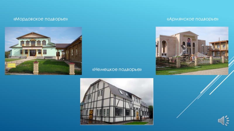 В «Национальной деревни» насчитывается 10 подворьев, где предусмотрены музеи истории, культуры и быта, кафе и рестораны, библиотеки с литературой на родном языке и.т.д. Это- русское подворье, казахское подворье, украинское подворье, башкирское, мордовское, немецкое, чувашское, армянское, белорусское, татарское. В национальных подворьях гости знакомятся с историческими и культурными традициями разных народов, их особенностями, жизнью и национальными костюмами.