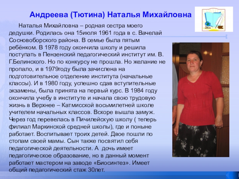 сестра моего дедушки. Родилась она 15июля 1961 года в с. Вачелай Сосновоборского района. В семье была пятым ребёнком. В 1978 году окончила школу и решила поступать в Пензенский педагогический институт им. В.Г.Белинского. Но по конкурсу не прошла. Но желание не пропало, и в 1979году была зачислена на подготовительное отделение института (начальные классы). И в 1980 году, успешно сдав вступительные экзамены, была принята на первый курс. В 1984 году окончила учебу в институте и начала свою трудовую жизнь в Верхнее – Катмисской восьмилетней школе учителем начальных классов. Вскоре вышла замуж. Через год перевелась в Пичилейскую школу ( теперь филиал Маркинской средней школы), где и поныне работает. Воспитывает троих детей. Двое пошли по стопам своей мамы. Сын также посвятил себя педагогической деятельности. А дочь имеет педагогическое образование, но в данный момент работает мастером на заводе «Биосинтез». Имеет общий педагогический стаж 30лет.