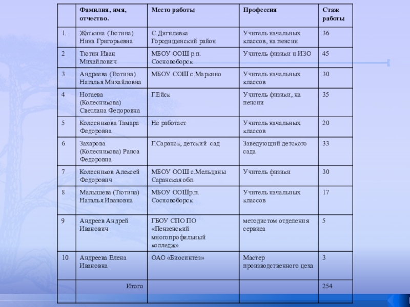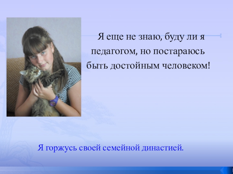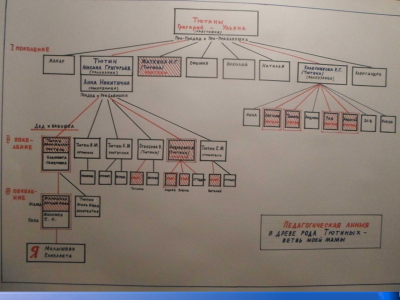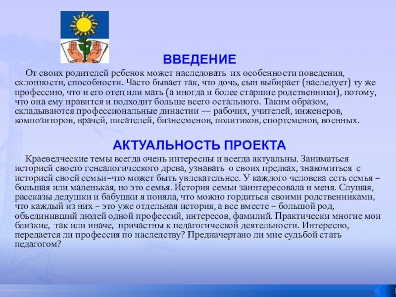 Краеведческие темы всегда очень интересны и всегда актуальны. Заниматься историей своего генеалогического древа, узнавать о своих предках, знакомиться с историей своей семьи–что может быть увлекательнее. У каждого человека есть семья – большая или маленькая, но это семья. История семьи заинтересовала и меня. Слушая, рассказы дедушки и бабушки я поняла, что можно гордиться своими родственниками, что каждый из них – это уже отдельная история, а все вместе – большой род, объединивший людей одной профессий, интересов, фамилий. Практически многие мои близкие, так или иначе, причастны к педагогической деятельности. Интересно, передается ли профессия по наследству? Предначертано ли мне судьбой стать педагогом?