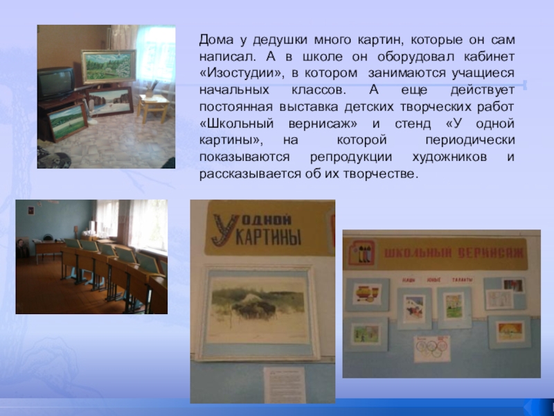 школе он оборудовал кабинет «Изостудии», в котором занимаются учащиеся начальных классов. А еще действует постоянная выставка детских творческих работ «Школьный вернисаж» и стенд «У одной картины», на которой периодически показываются репродукции художников и рассказывается об их творчестве.