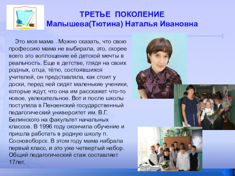 что свою профессию мама не выбирала, это, скорее всего это воплощение её детской мечты в реальность. Еще в детстве, глядя на своих родных, отца, тётю, состоявшихся учителей, он представляла, как стоит у доски, перед ней сидят маленькие ученики, которые ждут, что она им расскажет что-то новое, увлекательное. Вот и после школы поступила в Пензенский государственный педагогический университет им. В.Г.Белинского на факультет начальных классов. В 1996 году окончила обучение и пришла работать в родную школу п. Сосновоборск. В этом году мама набрала первый класс, и это уже четвертый набор. Общий педагогический стаж составляет 17лет.
