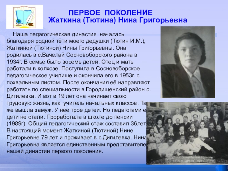 Наша педагогическая династия началась благодаря родной тёти моего дедушки (Тютин И.М.), Жаткиной (Тютиной) Нины Григорьевны. Она родилась в с.Вачелай Сосновоборского района в 1934г. В семье было восемь детей. Отец и мать работали в колхозе. Поступила в Сосновоборское педагогическое училище и окончила его в 1953г. с похвальным листом. После окончания её направляют работать по специальности в Городищенский район с. Дигилевка. И вот в 19 лет она начинает свою трудовую жизнь, как учитель начальных классов. Там же вышла замуж. У неё трое детей. Но педагогами её дети не стали. Проработала в школе до пенсии (1989г). Общий педагогический стаж составил 36лет. В настоящий момент Жаткиной (Тютиной) Нине Григорьевне 79 лет и проживает в с.Дигилевка. Нина Григорьевна является единственным представителем нашей династии первого поколения.