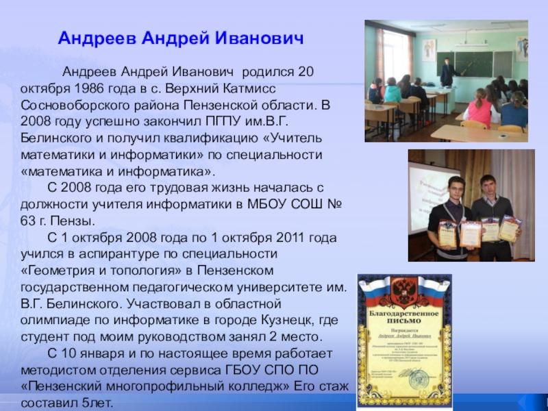 Слайд 15 Андреев Андрей Иванович родился 20 октября 1986 года в