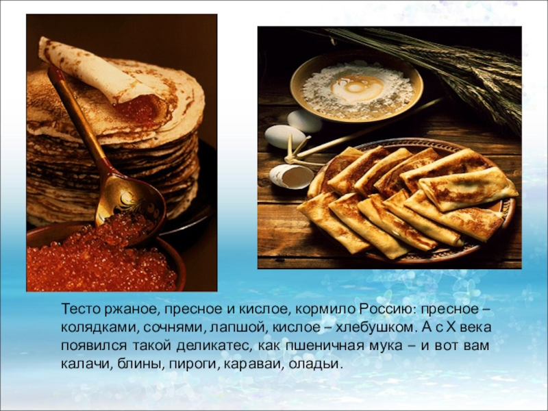 Слайд 17Тесто ржаное, пресное и кислое, кормило Россию: пресное – колядками, сочнями,