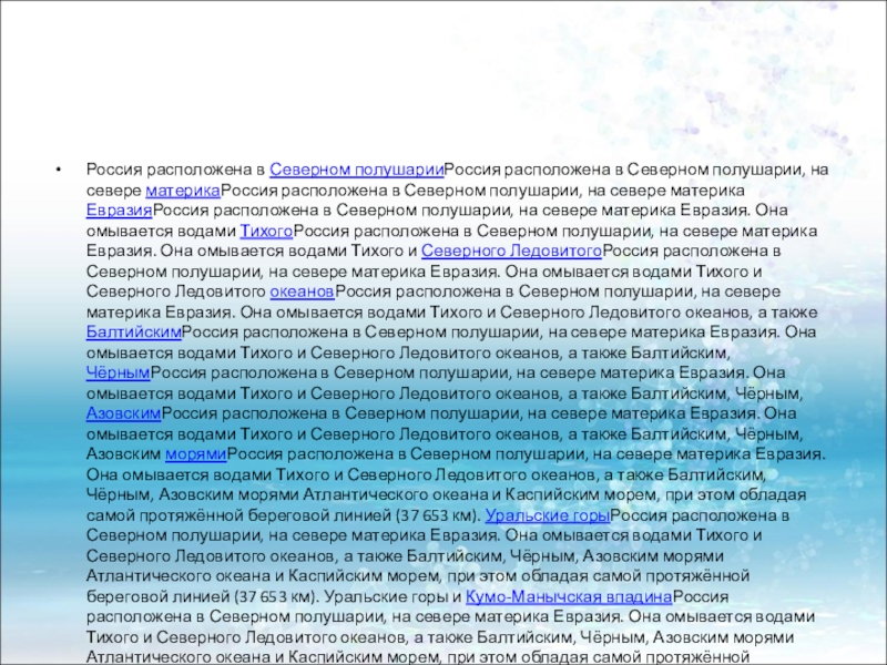 материкаРоссия расположена в Северном полушарии, на севере материка ЕвразияРоссия расположена в Северном полушарии, на севере материка Евразия. Она омывается водами ТихогоРоссия расположена в Северном полушарии, на севере материка Евразия. Она омывается водами Тихого и Северного ЛедовитогоРоссия расположена в Северном полушарии, на севере материка Евразия. Она омывается водами Тихого и Северного Ледовитого океановРоссия расположена в Северном полушарии, на севере материка Евразия. Она омывается водами Тихого и Северного Ледовитого океанов, а также БалтийскимРоссия расположена в Северном полушарии, на севере материка Евразия. Она омывается водами Тихого и Северного Ледовитого океанов, а также Балтийским, ЧёрнымРоссия расположена в Северном полушарии, на севере материка Евразия. Она омывается водами Тихого и Северного Ледовитого океанов, а также Балтийским, Чёрным, АзовскимРоссия расположена в Северном полушарии, на севере материка Евразия. Она омывается водами Тихого и Северного Ледовитого океанов, а также Балтийским, Чёрным, Азовским морямиРоссия расположена в Северном полушарии, на севере материка Евразия. Она омывается водами Тихого и Северного Ледовитого океанов, а также Балтийским, Чёрным, Азовским морями Атлантического океана и Каспийским морем, при этом обладая самой протяжённой береговой линией (37 653 км). Уральские горыРоссия расположена в Северном полушарии, на севере материка Евразия. Она омывается водами Тихого и Северного Ледовитого океанов, а также Балтийским, Чёрным, Азовским морями Атлантического океана и Каспийским морем, при этом обладая самой протяжённой береговой линией (37 653 км). Уральские горы и Кумо-Манычская впадинаРоссия расположена в Северном полушарии, на севере материка Евразия. Она омывается водами Тихого и Северного Ледовитого океанов, а также Балтийским, Чёрным, Азовским морями Атлантического океана и Каспийским морем, при этом обладая самой протяжённой береговой линией (37 653 км). Уральские горы и Кумо-Манычская впадина делят Россию на европейскую и азиатскую части, последняя включает в себя Северный КавказРоссия расположена в Северном полушарии, на севере материка Евразия. Она омывается водами Тихого и Северного Ледовитого океанов, а также Балтийским, Чёрным, Азовским морями Атлантического океана и Каспийским морем, при этом обладая самой протяжённой береговой линией (37 653 км). Уральские горы и Кумо-Манычская впадина делят Россию на европейскую и азиатскую части, последняя включает в себя Северный Кавказ, СибирьРоссия расположена в Северном полушарии, на севере материка Евразия. Она омывается водами Тихого и Северного Ледовитого океанов, а также Балтийским, Чёрным, Азовским морями Атлантического океана и Каспийским морем, при этом обладая самой протяжённой береговой линией (37 653 км). Уральские горы и Кумо-Манычская впадина делят Россию на европейскую и азиатскую части, последняя включает в себя Северный Кавказ, Сибирь и Дальний Восток России.