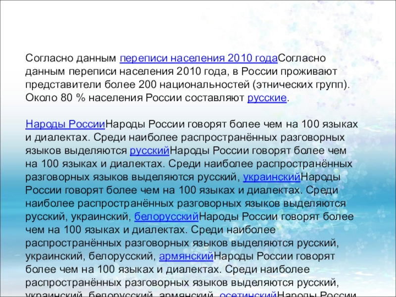 Народы РоссииНароды России говорят более чем на 100 языках и диалектах. Среди наиболее распространённых разговорных языков выделяются русскийНароды России говорят более чем на 100 языках и диалектах. Среди наиболее распространённых разговорных языков выделяются русский, украинскийНароды России говорят более чем на 100 языках и диалектах. Среди наиболее распространённых разговорных языков выделяются русский, украинский, белорусскийНароды России говорят более чем на 100 языках и диалектах. Среди наиболее распространённых разговорных языков выделяются русский, украинский, белорусский, армянскийНароды России говорят более чем на 100 языках и диалектах. Среди наиболее распространённых разговорных языков выделяются русский, украинский, белорусский, армянский, осетинскийНароды России говорят более чем на 100 языках и диалектах. Среди наиболее распространённых разговорных языков выделяются русский, украинский, белорусский, армянский, осетинский и немецкийНароды России говорят более чем на 100 языках и диалектах. Среди наиболее распространённых разговорных языков выделяются русский, украинский, белорусский, армянский, осетинский и немецкий (индоевропейская языковая семья), татарскийНароды России говорят более чем на 100 языках и диалектах. Среди наиболее распространённых разговорных языков выделяются русский, украинский, белорусский, армянский, осетинский и немецкий (индоевропейская языковая семья), татарский, чувашскийНароды России говорят более чем на 100 языках и диалектах. Среди наиболее распространённых разговорных языков выделяются русский, украинский, белорусский, армянский, осетинский и немецкий (индоевропейская языковая семья), татарский, чувашский и башкирскийНароды России говорят более чем на 100 языках и диалектах. Среди наиболее распространённых разговорных языков выделяются русский, украинский, белорусский, армянский, осетинский и немецкий (индоевропейская языковая семья), татарский, чувашский и башкирский (алтайская языковая семья), удмуртскийНароды России говорят более чем на 100 языках и диалектах. Среди наиболее распространённых разговорных языков выделяются русский, украинский, белорусский, армянский, осетинский и немецкий (индоевропейская языковая семья), татарский, чувашский и башкирский (алтайская языковая семья), удмуртский, марийскийНароды России говорят более чем на 100 языках и диалектах. Среди наиболее распространённых разговорных языков выделяются русский, украинский, белорусский, армянский, осетинский и немецкий (индоевропейская языковая семья), татарский, чувашский и башкирский (алтайская языковая семья), удмуртский, марийский и эрзянскийНароды России говорят более чем на 100 языках и диалектах. Среди наиболее распространённых разговорных языков выделяются русский, украинский, белорусский, армянский, осетинский и немецкий (индоевропейская языковая семья), татарский, чувашский и башкирский (алтайская языковая семья), удмуртский, марийский и эрзянский (уральская языковая семья), чеченскийНароды России говорят более чем на 100 языках и диалектах. Среди наиболее распространённых разговорных языков выделяются русский, украинский, белорусский, армянский, осетинский и немецкий (индоевропейская языковая семья), татарский, чувашский и башкирский (алтайская языковая семья), удмуртский, марийск