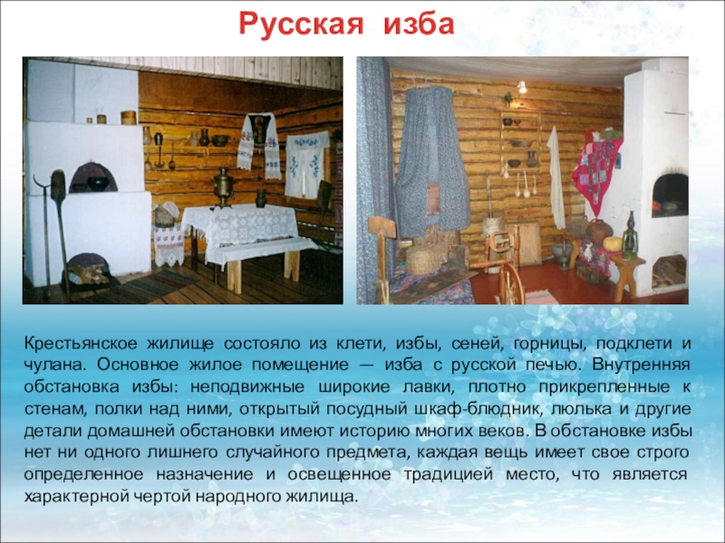 чулана. Основное жилое помещение — изба с русской печью. Внутренняя обстановка избы: неподвижные широкие лавки, плотно прикрепленные к стенам, полки над ними, открытый посудный шкаф-блюдник, люлька и другие детали домашней обстановки имеют историю многих веков. В обстановке избы нет ни одного лишнего случайного предмета, каждая вещь имеет свое строго определенное назначение и освещенное традицией место, что является характерной чертой народного жилища.