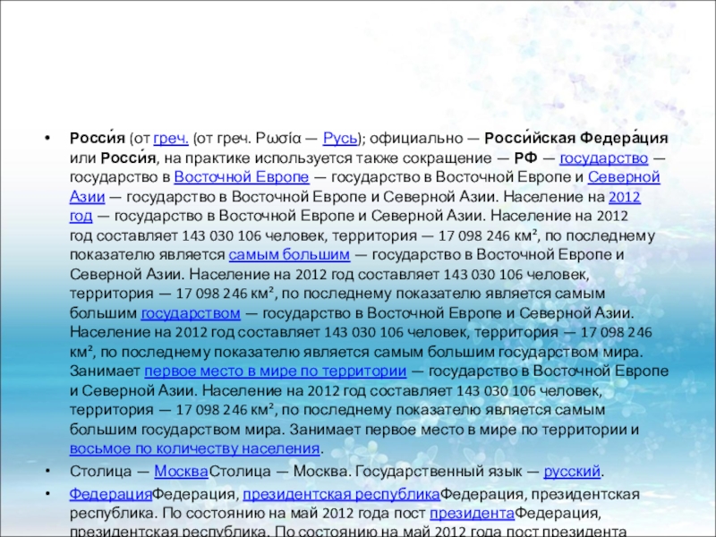 Росси́я, на практике используется также сокращение — РФ — государство — государство в Восточной Европе — государство в Восточной Европе и Северной Азии — государство в Восточной Европе и Северной Азии. Население на 2012 год — государство в Восточной Европе и Северной Азии. Население на 2012 год составляет 143 030 106 человек, территория — 17 098 246 км², по последнему показателю является самым большим — государство в Восточной Европе и Северной Азии. Население на 2012 год составляет 143 030 106 человек, территория — 17 098 246 км², по последнему показателю является самым большим государством — государство в Восточной Европе и Северной Азии. Население на 2012 год составляет 143 030 106 человек, территория — 17 098 246 км², по последнему показателю является самым большим государством мира. Занимает первое место в мире по территории — государство в Восточной Европе и Северной Азии. Население на 2012 год составляет 143 030 106 человек, территория — 17 098 246 км², по последнему показателю является самым большим государством мира. Занимает первое место в мире по территории и восьмое по количеству населения.