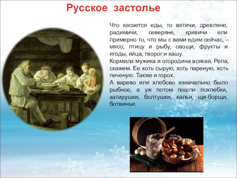 Что касается еды, то вятичи, древляне, радимичи, северяне, кривичи ели