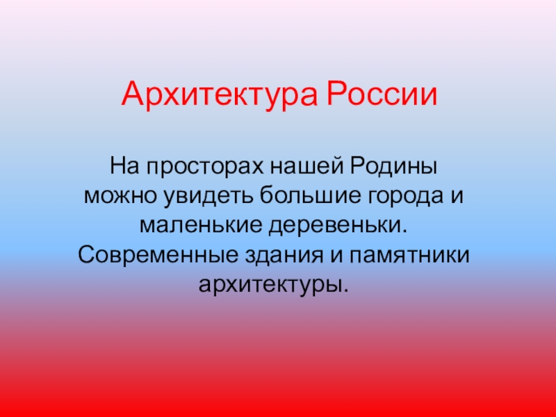 Архитектура РоссииНа просторах нашей Родины можно увидеть большие города и маленькие деревеньки. Современные здания и памятники архитектуры.