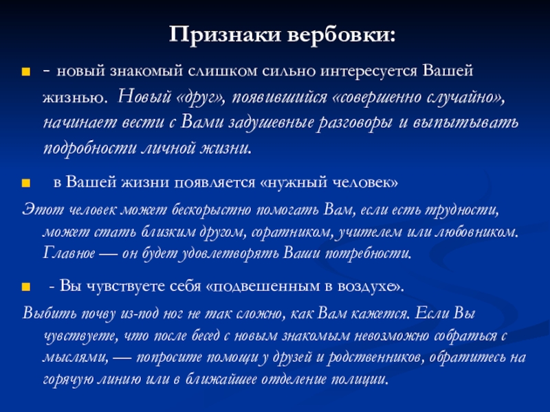Выбить почву из-под ног не так сложно, как Вам кажется. Если Вы чувствуете, что после бесед с новым знакомым невозможно собраться с мыслями, — попросите помощи у друзей и родственников, обратитесь на горячую линию или в ближайшее отделение полиции.