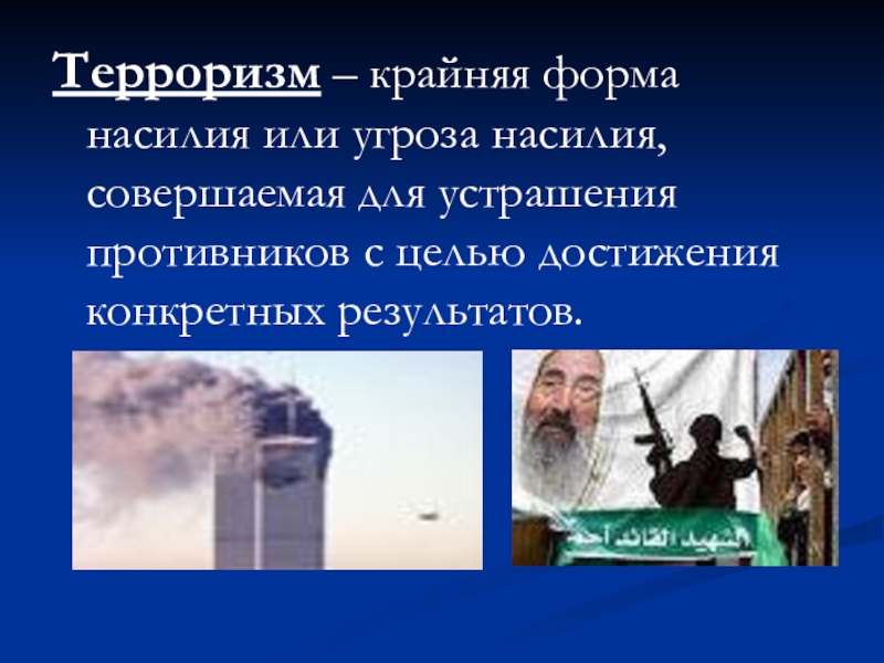 Слайд 2Терроризм – крайняя форма насилия или угроза насилия, совершаемая для устрашения
