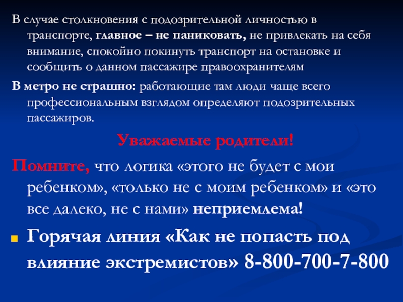 Слайд 10В случае столкновения с подозрительной личностью в транспорте, главное – не паниковать, не