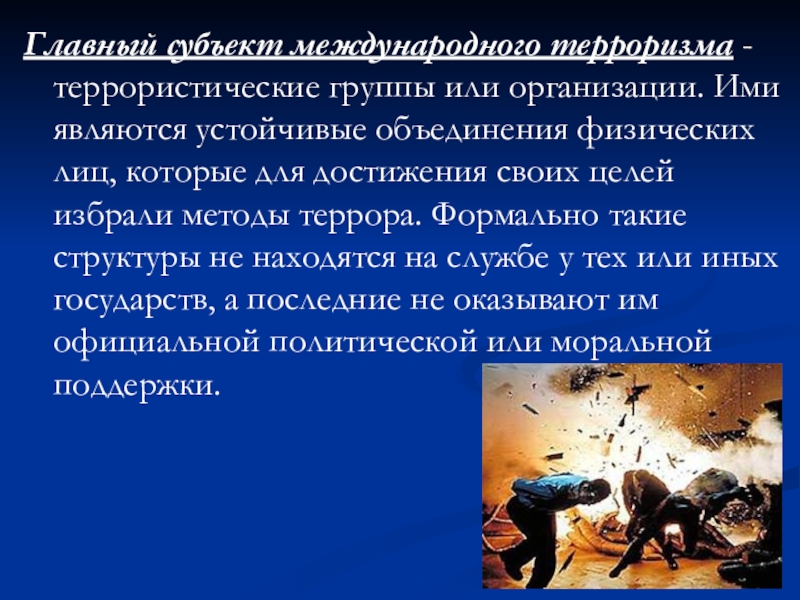 Слайд 3Главный субъект международного терроризма - террористические группы или организации. Ими являются