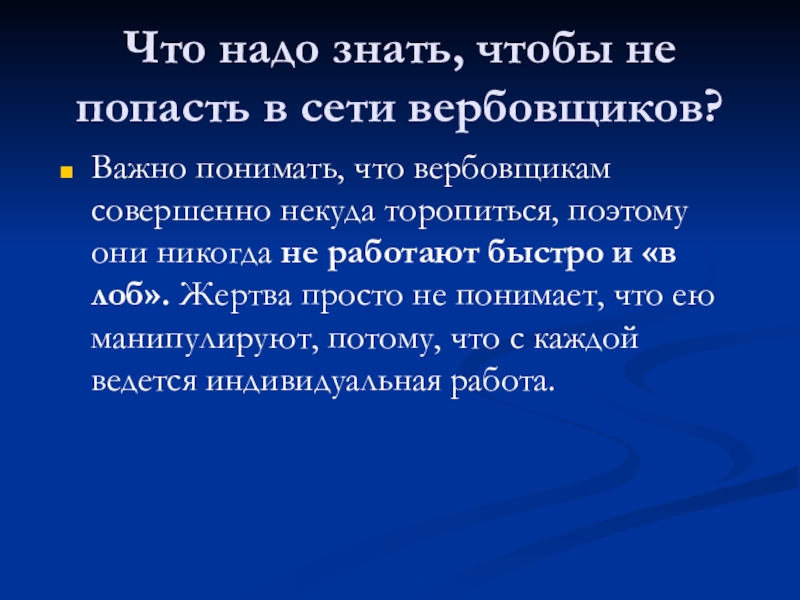 вербовщикам совершенно некуда торопиться, поэтому они никогда не работают быстро и «в лоб». Жертва просто не понимает, что ею манипулируют, потому, что с каждой ведется индивидуальная работа.