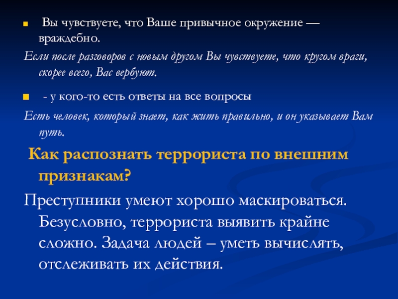 Слайд 9Признаки террориста по внешним признакам: