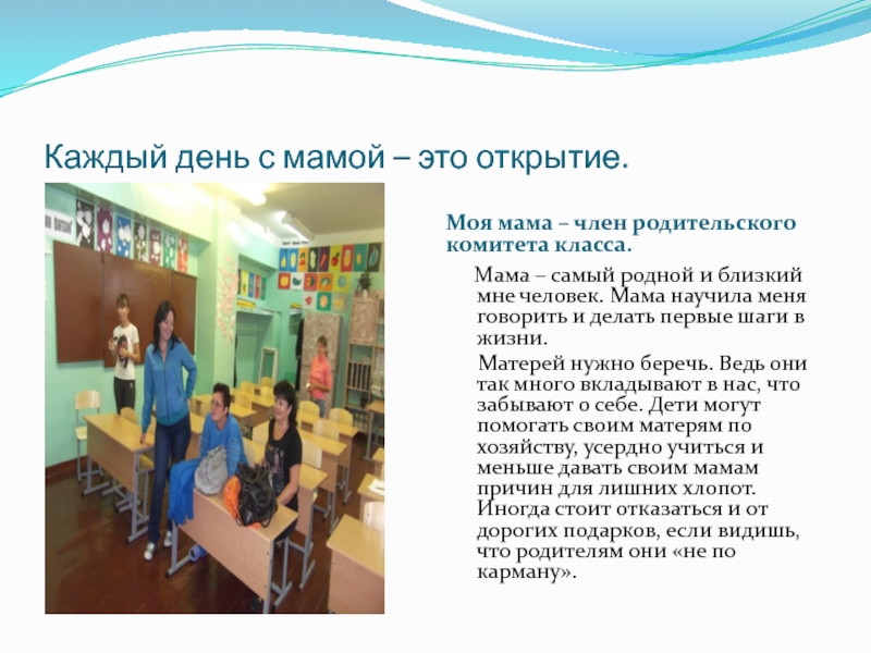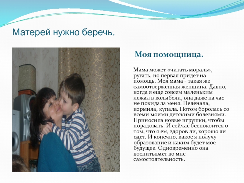 Матерей нужно беречь. Ведь они так много вкладывают в нас, что забывают о себе. Дети могут помогать своим матерям по хозяйству, усердно учиться и меньше давать своим мамам причин для лишних хлопот. Иногда стоит отказаться и от дорогих подарков, если видишь, что родителям они «не по карману».
