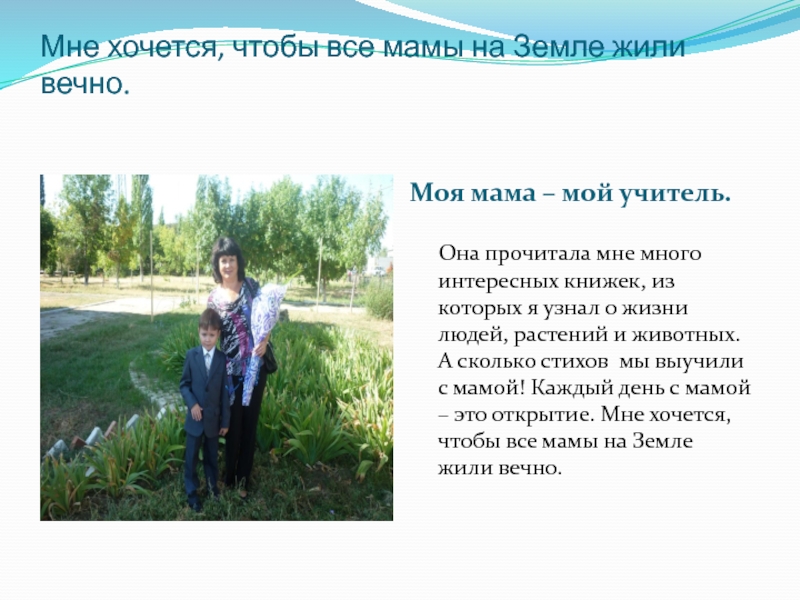 Она прочитала мне много интересных книжек, из которых я узнал о жизни людей, растений и животных. А сколько стихов мы выучили с мамой! Каждый день с мамой – это открытие. Мне хочется, чтобы все мамы на Земле жили вечно.