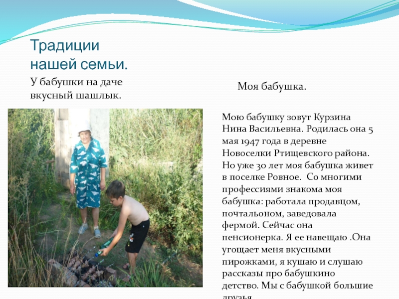 Мою бабушку зовут Курзина Нина Васильевна. Родилась она 5 мая 1947 года в деревне Новоселки Ртищевского района. Но уже 30 лет моя бабушка живет в поселке Ровное. Со многими профессиями знакома моя бабушка: работала продавцом, почтальоном, заведовала фермой. Сейчас она пенсионерка. Я ее навещаю .Она угощает меня вкусными пирожками, я кушаю и слушаю рассказы про бабушкино детство. Мы с бабушкой большие друзья.