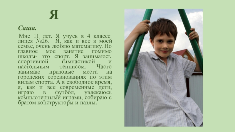 Я, как и все в моей семье, очень люблю математику. Но главное мое занятие помимо школы- это спорт. Я занимаюсь спортивной гимнастикой и настольным теннисом. Часто занимаю призовые места на городских соревнованиях по этим видам спорта. А в свободное время, я, как и все современные дети, играю в футбол, увлекаюсь компьютерными играми, собираю с братом конструкторы и пазлы.