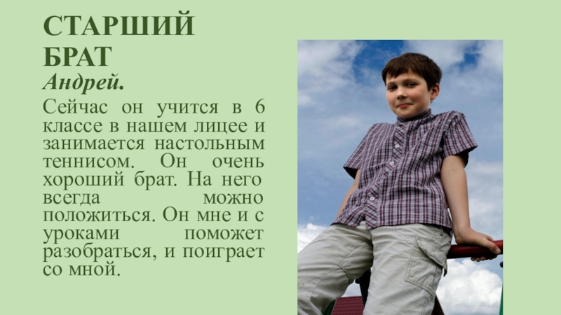 занимается настольным теннисом. Он очень хороший брат. На него всегда можно положиться. Он мне и с уроками поможет разобраться, и поиграет со мной.