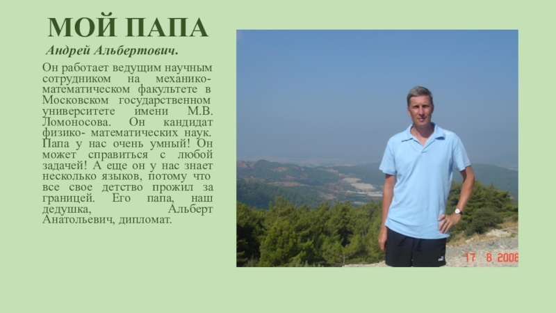факультете в Московском государственном университете имени М.В. Ломоносова. Он кандидат физико- математических наук. Папа у нас очень умный! Он может справиться с любой задачей! А еще он у нас знает несколько языков, потому что все свое детство прожил за границей. Его папа, наш дедушка, Альберт Анатольевич, дипломат.