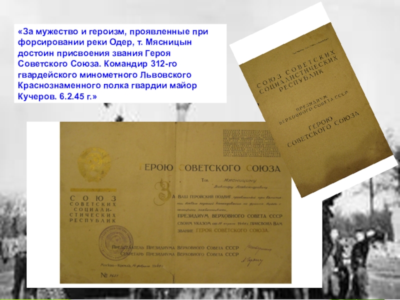 Слайд 20«За мужество и героизм, проявленные при форсировании реки Одер, т. Мясницын