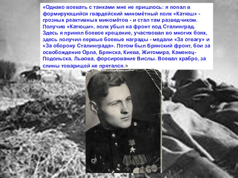 Слайд 17«Однако воевать с танками мне не пришлось: я попал в формирующийся