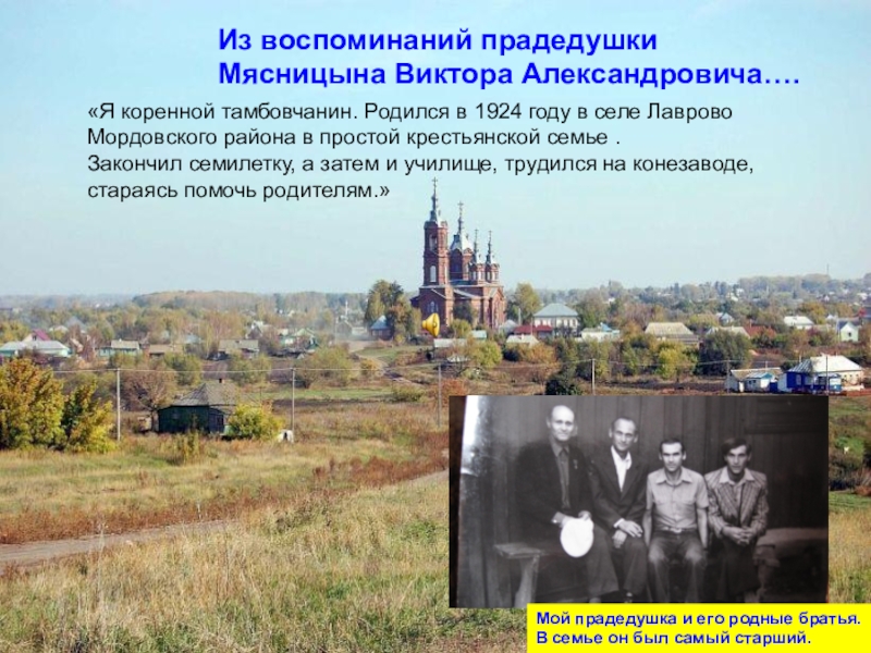Слайд 14«Я коренной тамбовчанин. Родился в 1924 году в селе Лаврово Мордовского