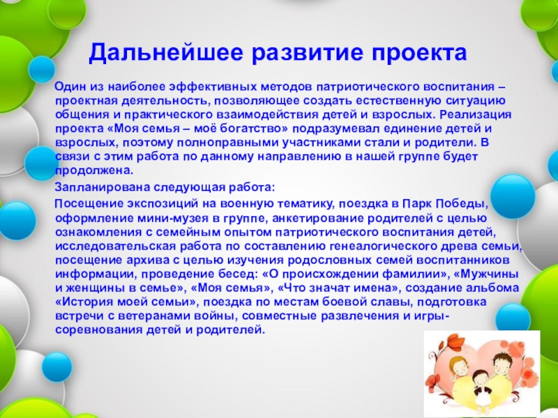 воспитания – проектная деятельность, позволяющее создать естественную ситуацию общения и практического взаимодействия детей и взрослых. Реализация проекта «Моя семья – моё богатство» подразумевал единение детей и взрослых, поэтому полноправными участниками стали и родители. В связи с этим работа по данному направлению в нашей группе будет продолжена.