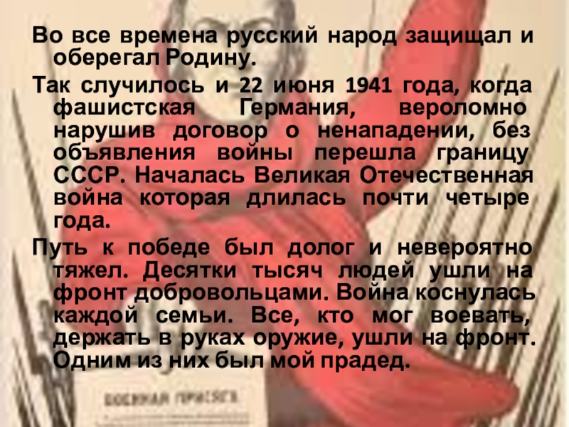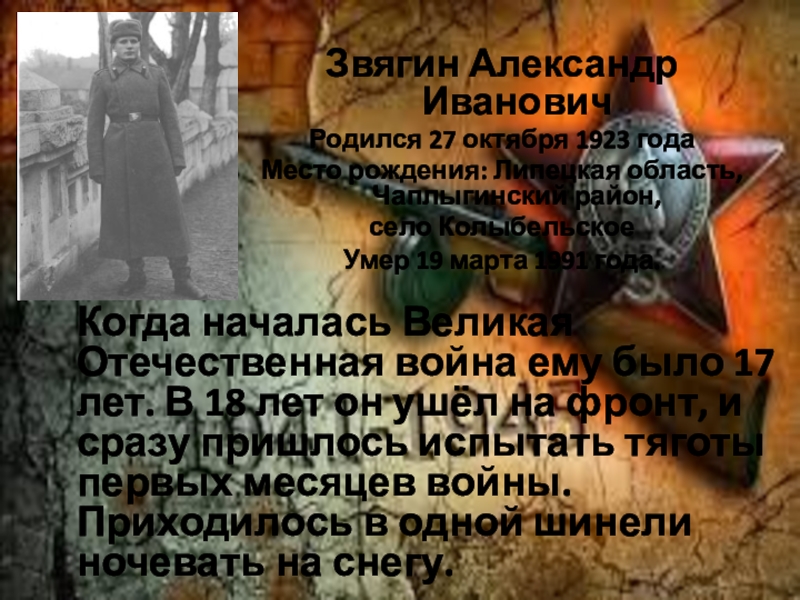 Когда началась Великая Отечественная война ему было 17 лет. В 18 лет он ушёл на фронт, и сразу пришлось испытать тяготы первых месяцев войны. Приходилось в одной шинели ночевать на снегу.
