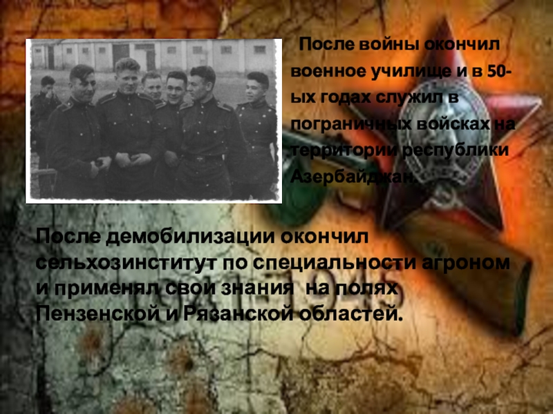 После демобилизации окончил сельхозинститут по специальности агроном и применял свои знания на полях Пензенской и Рязанской областей.