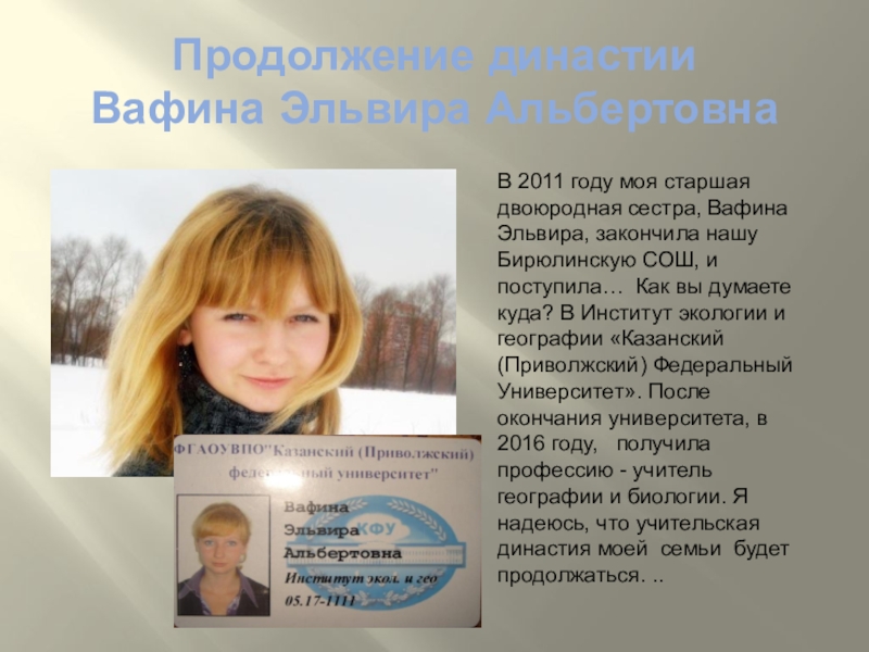 Эльвира, закончила нашу Бирюлинскую СОШ, и поступила… Как вы думаете куда? В Институт экологии и географии «Казанский (Приволжский) Федеральный Университет». После окончания университета, в 2016 году, получила профессию - учитель географии и биологии. Я надеюсь, что учительская династия моей семьи будет продолжаться. ..