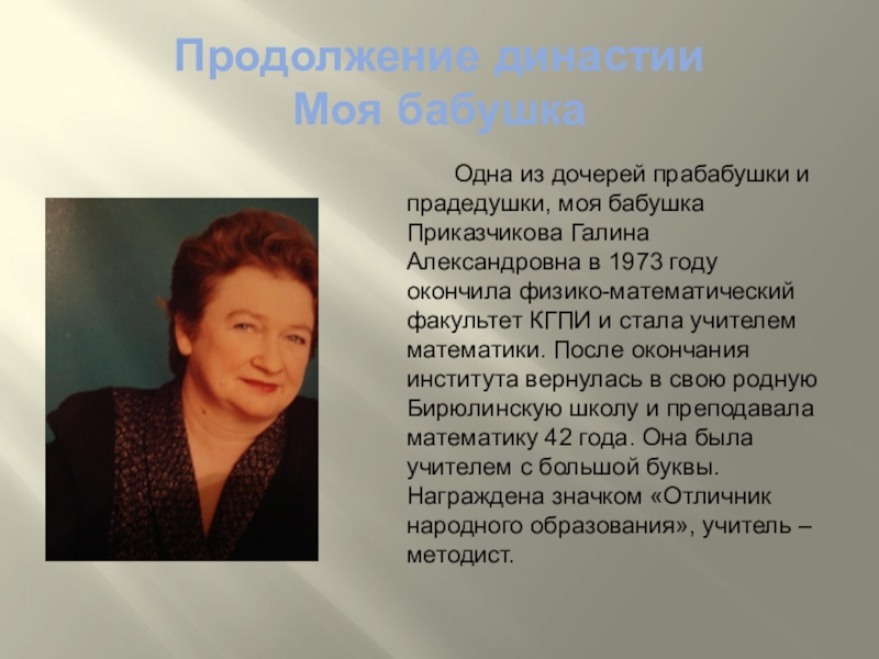 и прадедушки, моя бабушка Приказчикова Галина Александровна в 1973 году окончила физико-математический факультет КГПИ и стала учителем математики. После окончания института вернулась в свою родную Бирюлинскую школу и преподавала математику 42 года. Она была учителем с большой буквы. Награждена значком «Отличник народного образования», учитель – методист.