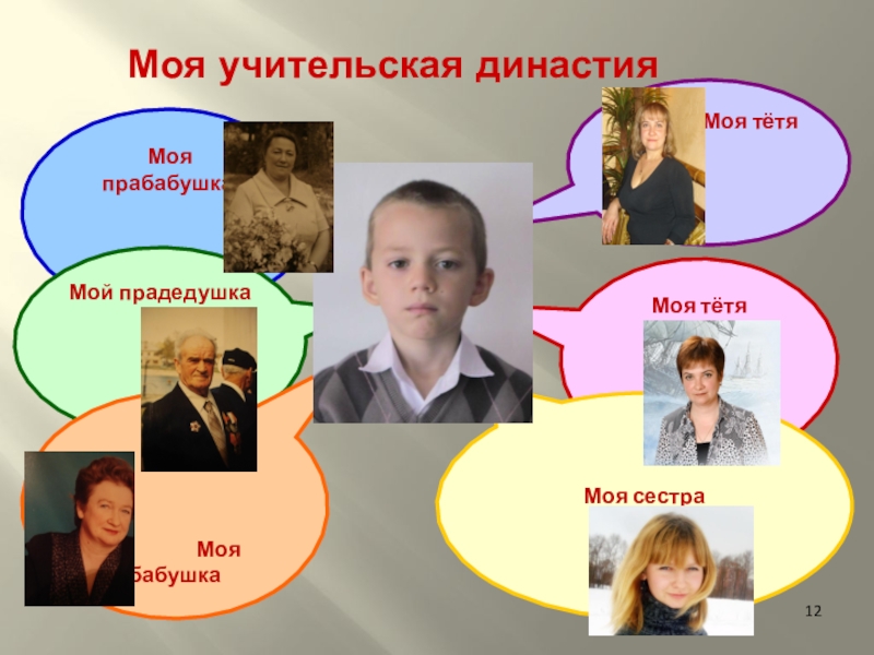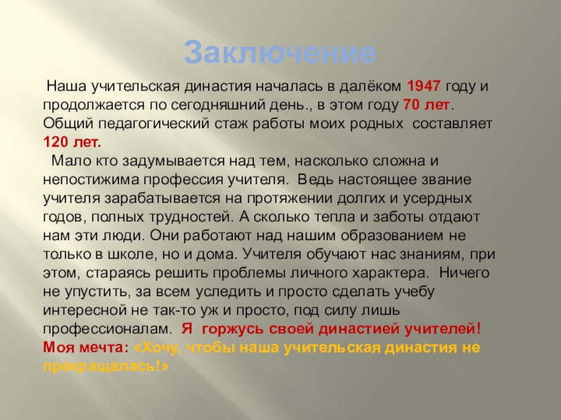 Мало кто задумывается над тем, насколько сложна и непостижима профессия учителя. Ведь настоящее звание учителя зарабатывается на протяжении долгих и усердных годов, полных трудностей. А сколько тепла и заботы отдают нам эти люди. Они работают над нашим образованием не только в школе, но и дома. Учителя обучают нас знаниям, при этом, стараясь решить проблемы личного характера. Ничего не упустить, за всем уследить и просто сделать учебу интересной не так-то уж и просто, под силу лишь профессионалам. Я горжусь своей династией учителей!