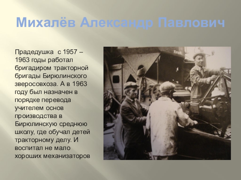 Прадедушка с 1957 – 1963 годы работал бригадиром тракторной