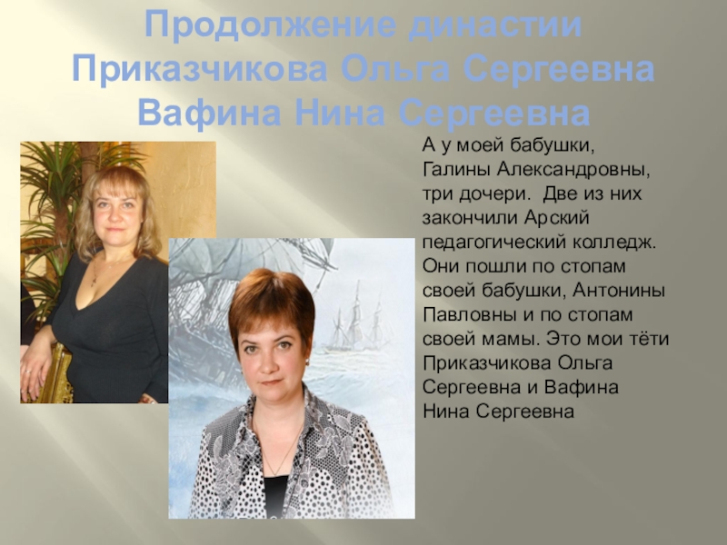 три дочери. Две из них закончили Арский педагогический колледж. Они пошли по стопам своей бабушки, Антонины Павловны и по стопам своей мамы. Это мои тёти Приказчикова Ольга Сергеевна и Вафина Нина Сергеевна