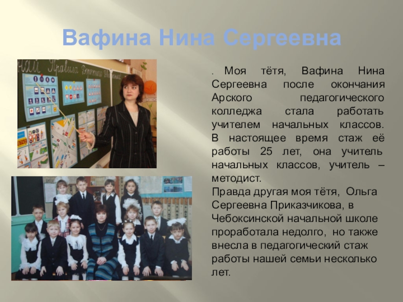 по сегодняшний день., в этом году 70 лет. Общий педагогический стаж работы моих родных составляет 120 лет.