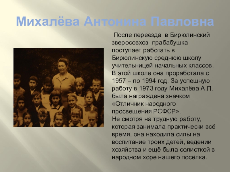 в Бирюлинскую среднюю школу учительницей начальных классов. В этой школе она проработала с 1957 – по 1994 год. За успешную работу в 1973 году Михалёва А.П. была награждена значком «Отличник народного просвещения РСФСР».