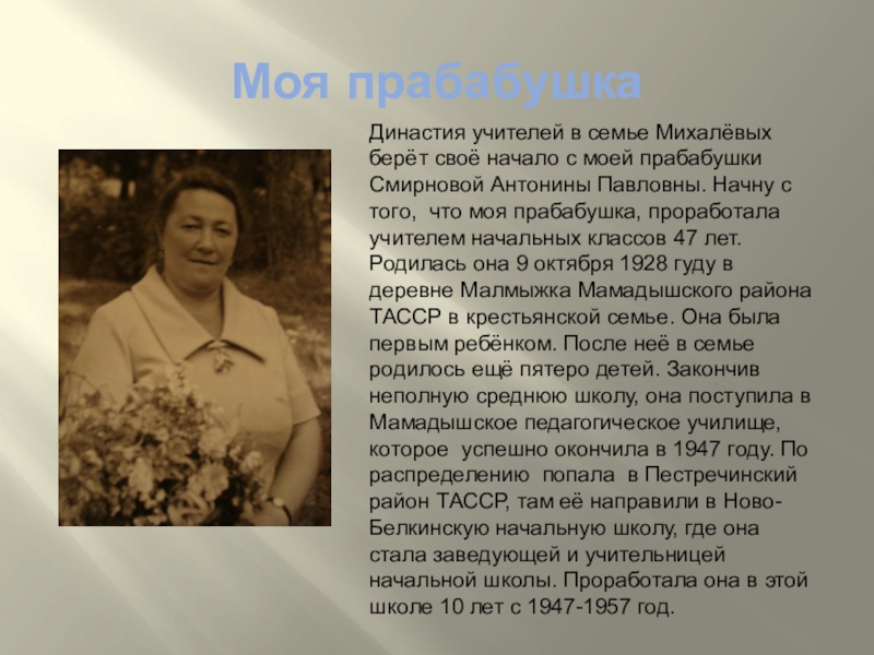 с моей прабабушки Смирновой Антонины Павловны. Начну с того, что моя прабабушка, проработала